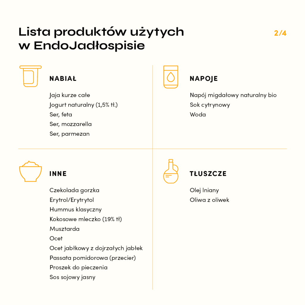 W środku znajdziesz gotowy, 7-dniowy jadłospis oparty na łatwo dostępnych produktach, dzięki któremu bez stresu zaczniesz wspierać swój organizm w walce z endometriozą.