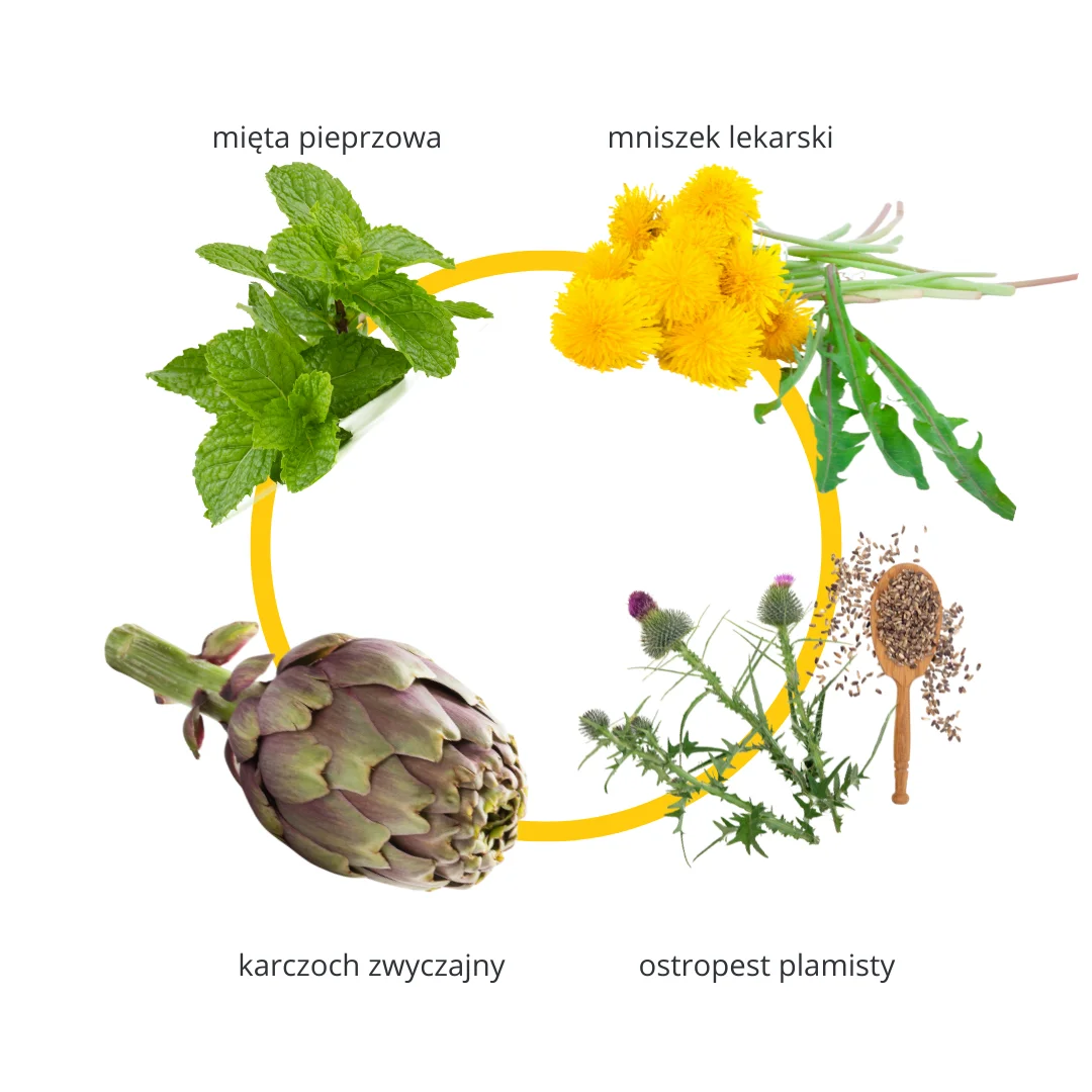 mięta pieprzowa (liść)*, mniszek lekarski (liść)*, ostropest plamisty (owoc)*, karczoch zwyczajny (ziele)* w różnych proporcjach